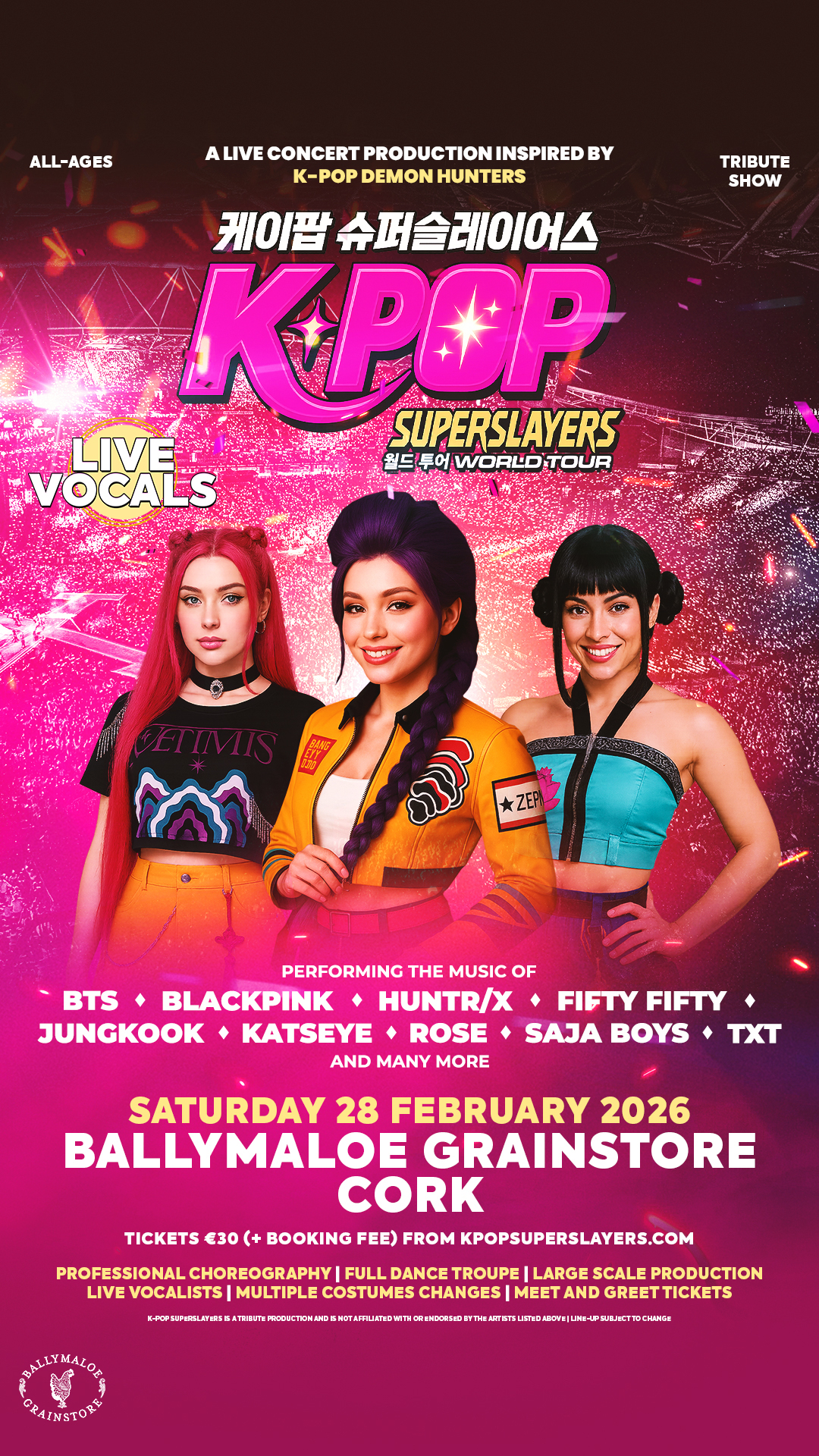 Get ready for K-POP Superslayers Live! the ultimate K-Pop experience — a full-scale live show featuring all live vocals, bursting with energy, style, and sound inspired by KPOP Demon Hunters featuring songs from BTS, TXT, HUNTR/X, KATSEYE, SAJABOYS, JUNGKOOK, and BLACKPINK, this high-octane production fuses live vocals, explosive choreography, stunning costumes, and cutting-edge special effects to recreate the magic of a Seoul arena concert.