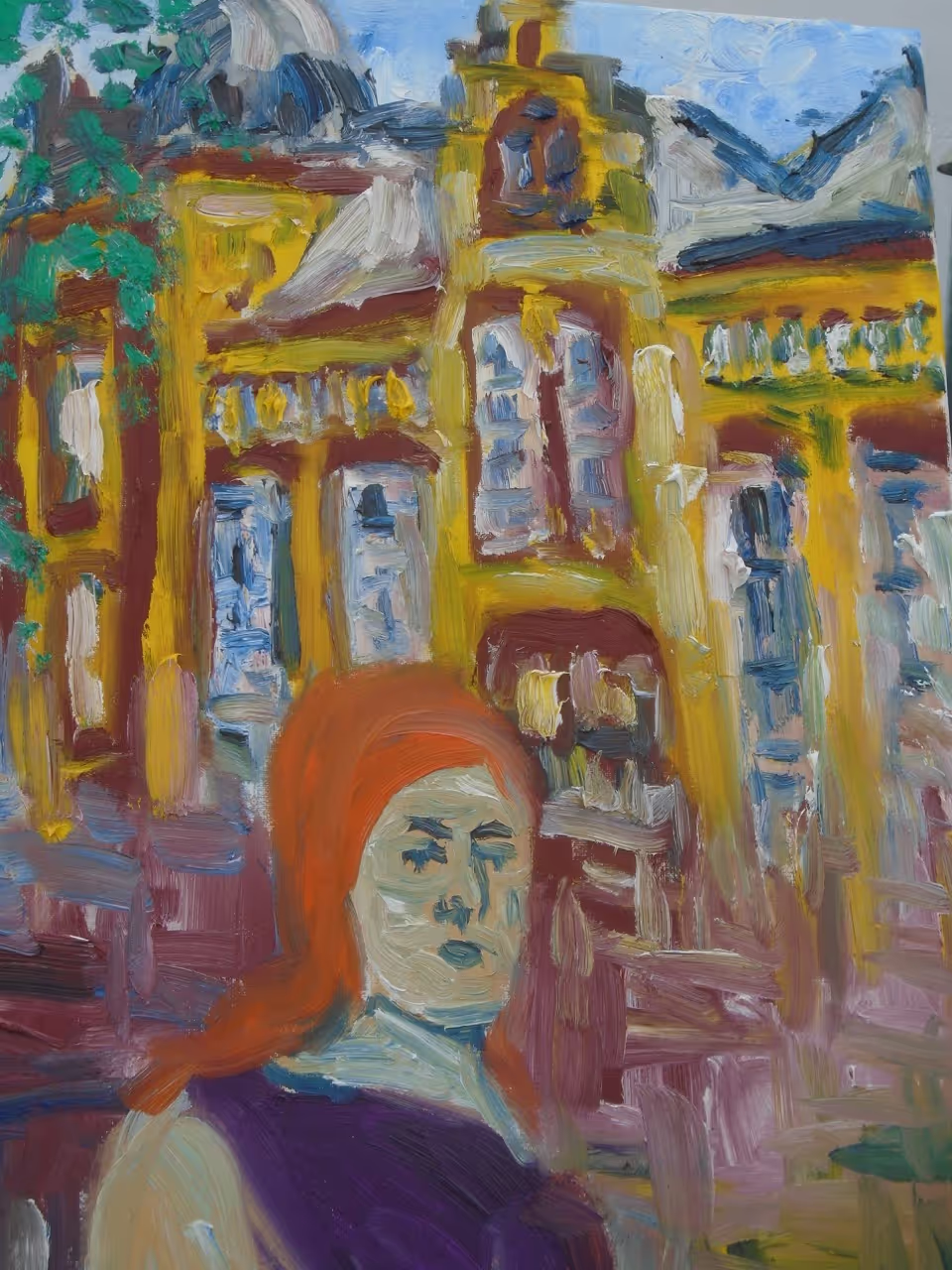 Mel is fascinated with colour and light, and also with architecture; the paintings are based on European cities that Mel has visited, with a portrait as a central theme (Mel loves travelling and has been to a number of European countries).