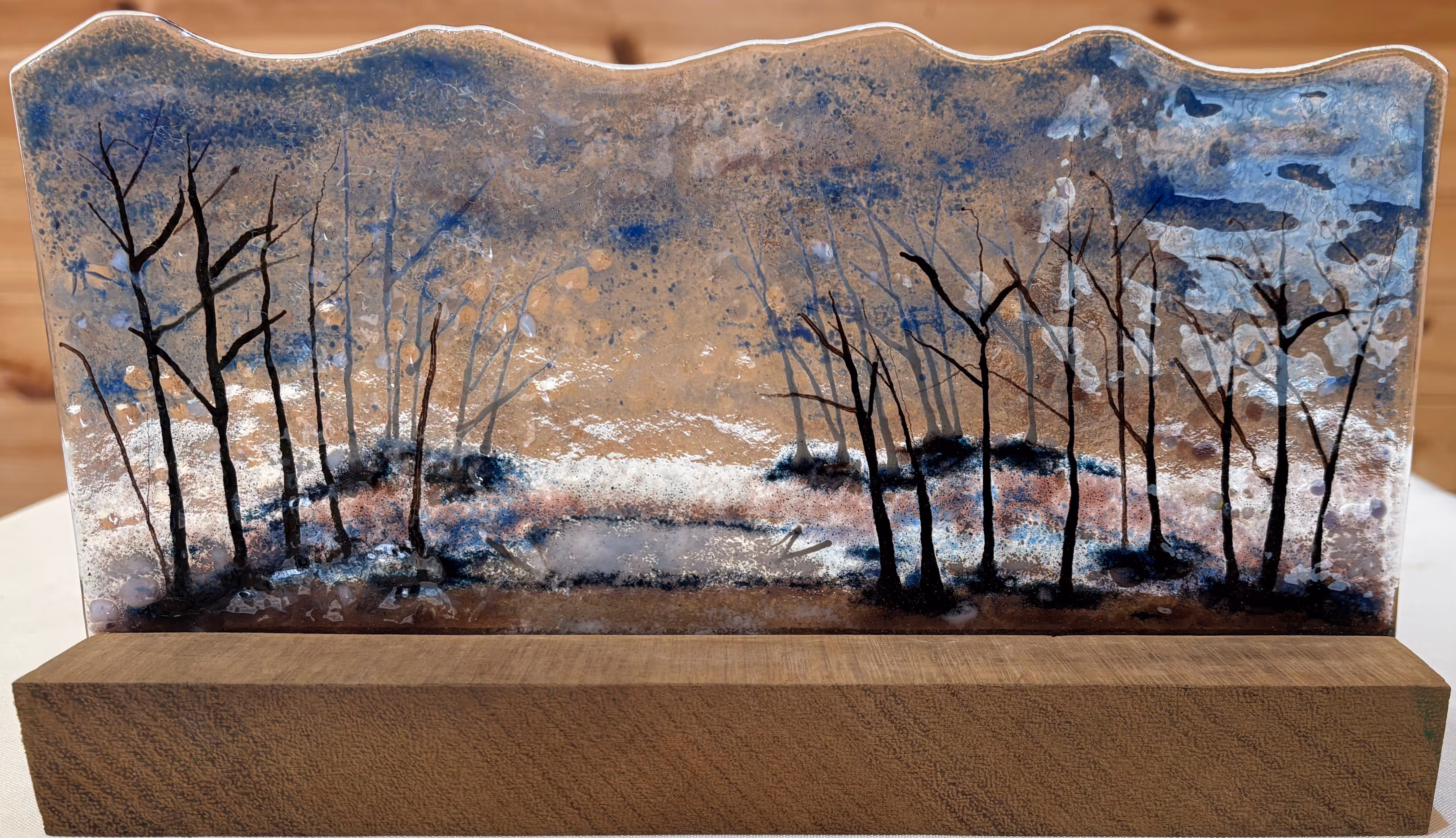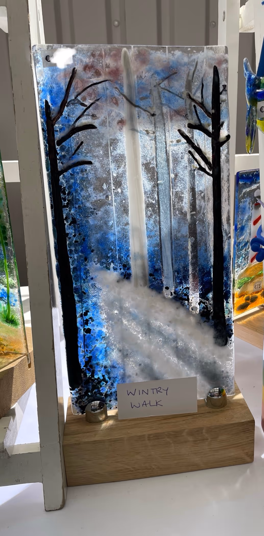 I design and create fused glass art in my studio in Co. Wexford, each piece is different and usually nature inspired. To make a design I cut different types, textures and colours of glass and often use powdered or granulated glass to build depth, these are arranged in the art forms to produce pictures, free-standing or hanging pieces, also bowls and dishes. I also use a blow torch to pull thin pieces of glass into shapes like trees or branches. These pieces are placed in my kiln and I programme to kiln depending on the effect I need, the pieces are n the kiln for 18-24 hours at temperatures up to 780’C. To build layers the pieces are n can go back into the a number of times. To achieve a shape other than flat the piece is kiln formed again over a mould. My business name is Siorghlas Glass Art, siorghlas is Irish for evergreen and as well as describing trees that keep their foliage it also depicts people or things that always seem fresh, lively and interesting and remain popular despite their age, which is how I like my glass art to be.